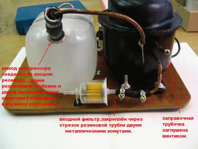Когда с электрической частью закончено – приступаем к монтажу остальной пневматической системы. На входе компрессора с помощью отрезка резиновой трубки и 2 хомутов закрепляем фильтр тонкой очистки для бензина. Возможно, кому-то покажется лишней эта деталь, но это ведь не дорого, и всяческая пыль не будет попадать внутрь компрессора, тогда оттуда её уже не извлечь. Главное при всех последующих операциях не залить этот фильтр маслом, он потеряет от этого свои свойства. Далее отрезком резиновой трубки и 2 хомутами соединяем выход компрессора со входом ресивера. Действовать надо аккуратно, дабы не выломать трубки из крышки. На выход ресивера так же натягиваем резиновую трубку с 2 хомутами, закрепляем фильтр для дизельного топлива. Этот фильтр можно заполнить силикагелем, тогда он будет выполнять 2 функции – уловитель влаги и переходник для закрепления резиновой и хлорвиниловой трубок. Можно конечно обойтись и без него, хлорвиниловую трубку натянуть прямо на выход ресивера, но такое соединение не будет полностью герметично и прочно, с гладкой медной трубки шланг будет срываться.