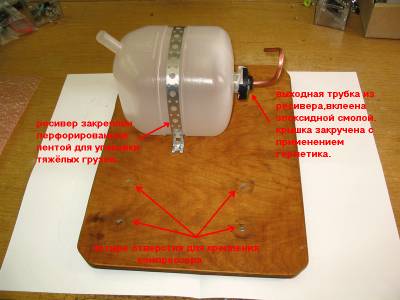 Самое сложное – закрепить ресивер. Устанавливать его надо первым, что бы потом не мешали остальные детали агрегата. Протыкать ресивер насквозь крепежом не стоит, здесь нужен творческий подход – например, использовать резиновую трубку или полоску, прочную ткань или кожу, перфорированную ленту для упаковки тяжёлых грузов и т.д. Один край крепящей ленты прикручивается шурупом к фанере, перекидывается через ресивер и с натягом прикручивается с другой стороны.