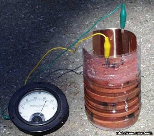 Прицепите "крокодильчики" к обеим пластинам. Соедините провод от чистой меди к плюсу,а провод от пластины с оксидом - к минусу.