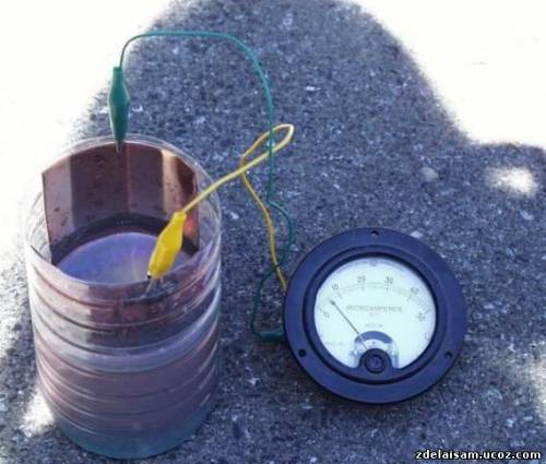 На фотографии выше готовая солнечная батарея В ТЕНИ,амперметр показывает приблизительно 6 милиампер.Но даже в темноте эта батарея будет давать несколько милиампер))