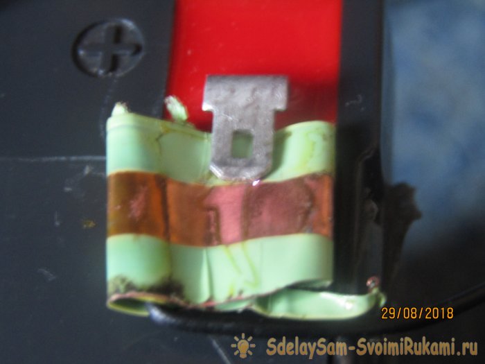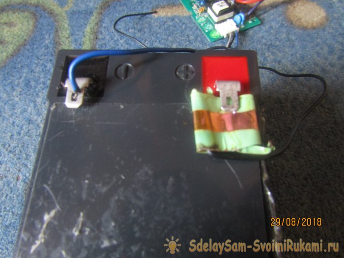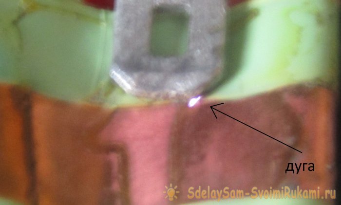 После этого подаем питание на плату 12 Вольт. Внимание! Опасное напряжение!Теперь необходимо зажать на второй клемме аккумулятора пластинку так чтобы прямого контакта не было. А ток проходил по максимально короткой искровой дуге.